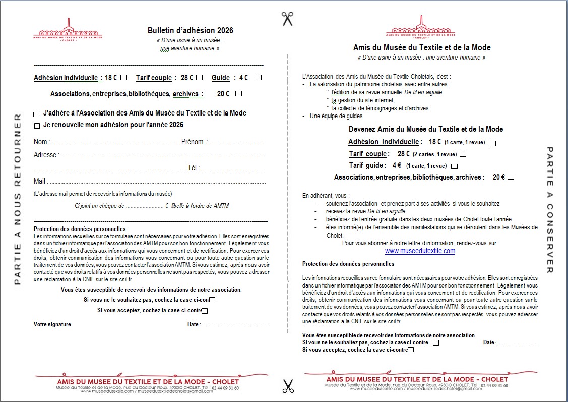 L’entrée est gratuite pour les scolaires, professeurs et étudiants ainsi que pour les adhérents de l’association des Amis du Musée du Textile et de la Mode.
